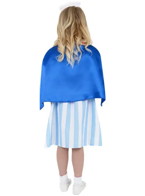 Beinhaltet ein Kleid in Blau und Weiß mit Umhang und weißer Haube mit einem roten Kreuz.