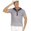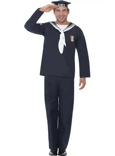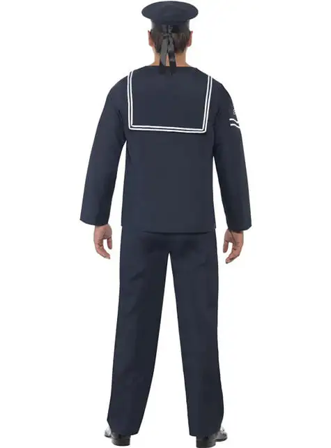 Beinhaltet ein Hemd mit Marinekragen, eine dunkle Hose und eine Mütze.