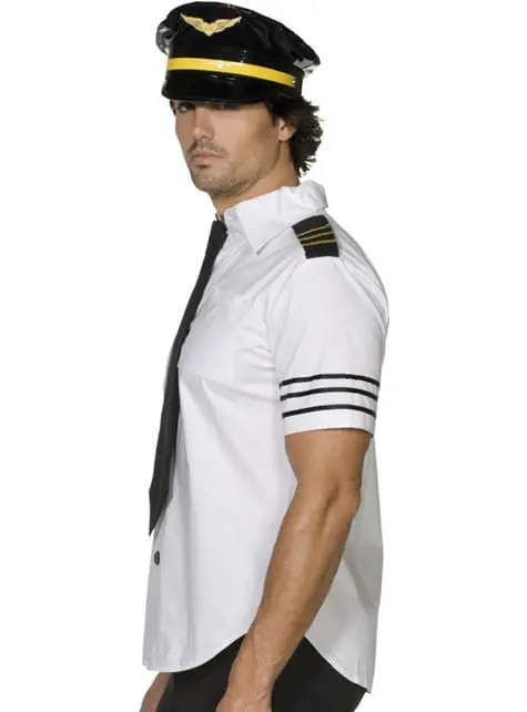 Beinhaltet ein weißes Hemd mit kurzen Ärmeln, eine schwarze Krawatte und einen Hut eines Flieger Kommandanten.