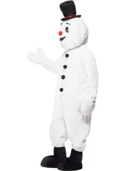 Dieses eisige Kostüm eines Schneemanns besteht aus einem weißen Overall mit vorgetäuschten schwarzen Knöpfen, schwarzen Überschuhen und einer enormen Maske mit dem Gesicht des Schneemanns und dem eingearbeiteten Zylinderhut.