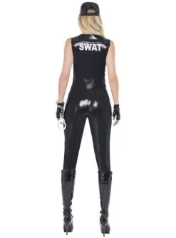 Dieses verführerische Kostüm einer SWAT Agentin besteht aus einem eng anliegenden Overall mit Uniform Details, einer Mütze mit den Initialen SWAT und dazu passenden fingerlosen Handschuhen.