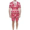 Beinhaltet ein Kleid in Rot und Weiß im Stil Bandeau, eine weihnachtliche Mütze, eine Schulterjacke mit langen Ärmeln in Rot und eine Gürtel mit Schnalle.